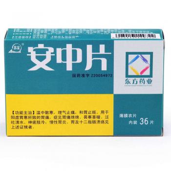 中片(奥皇)适用于治疗阳虚胃寒所致的胃痛,症见胃痛绵绵、畏寒喜暖、泛吐清水、神疲肢冷;慢性胃炎、胃及十二指肠溃疡见上述证候者。安中片的成份是桂枝、延胡索(醋制)、牡蛎(煅)、小茴香、高良姜、砂仁、甘草。其中桂枝的功能主治是发汗解肌,温经通脉。治风寒表证,肩背肢节酸疼,胸痹痰饮,经闭癥瘕。小茴香具有温肾散寒,和胃理气的作用。治寒疝,少腹冷痛,肾虚腰痛,胃痛,呕吐,干、湿脚气。砂仁的作用是行气调中,和胃,醒脾。治腹痛痞胀,胃呆食滞,噎膈呕吐,寒泻冷痢,妊娠胎动。