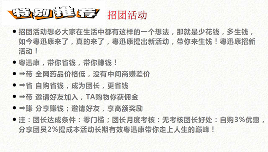 想必大家在生活中都有这样的一个想法,那就是少花钱,多生钱,如今粤迅康来了,真的来了,粤迅康提出新活动,带你来生钱!粤迅康招新活动!粤迅康,带你省钱,带你赚钱!➡带全网药品价格低,没有中间商赚差价➡省自