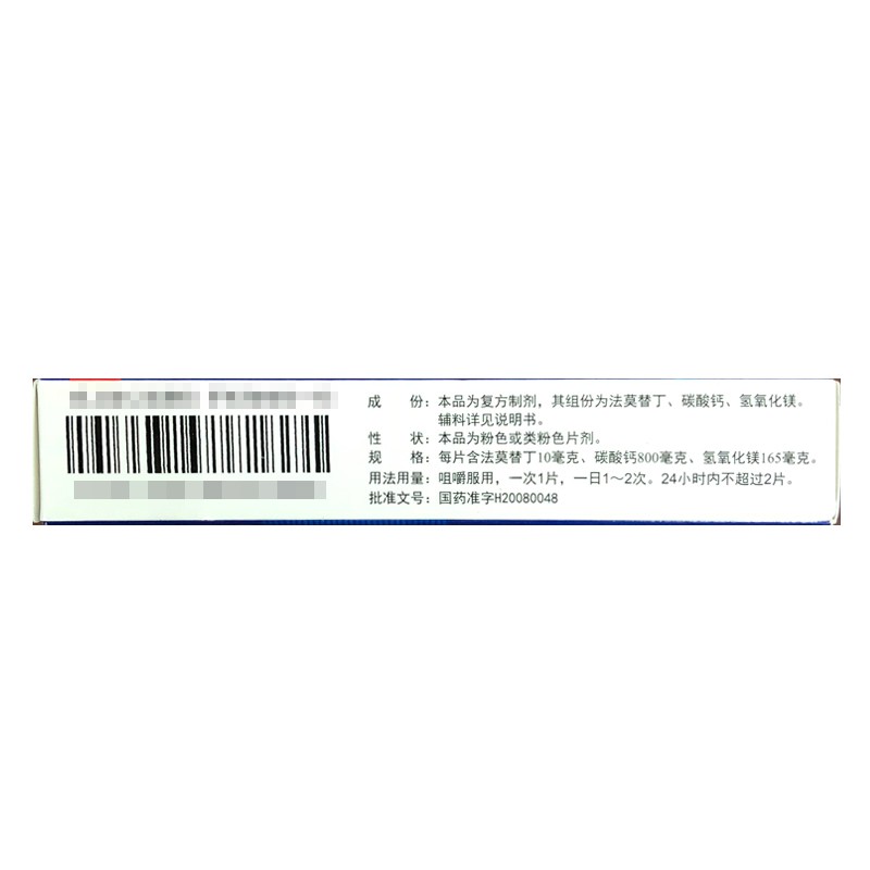 | 成分原料 | 本品为复方制剂,其组分为:每片含碳酸钙800mg、氢氧化镁165mg、法莫替丁10mg。 |