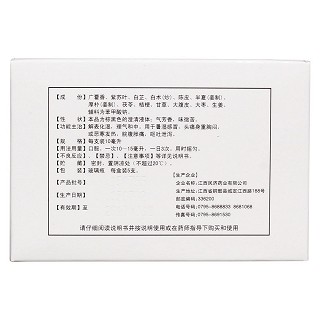 【药品成份】苍术、陈皮、厚朴(姜制)、白芷、茯苓、大腹皮、生半夏、甘草浸膏、广藿香油、紫苏叶油、桔梗、生姜、大枣。辅料为苯甲酸钠。