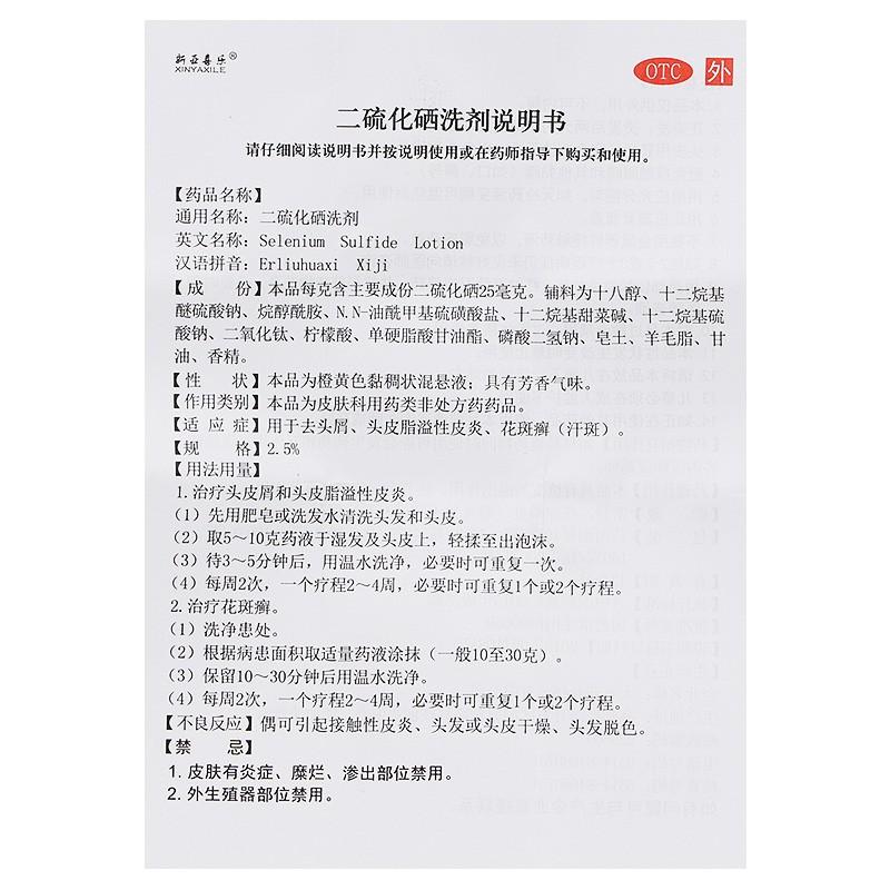 【药品成份】本品每克含主要成份二硫化硒25毫克。辅料为;二氧化钛、甘油皂土、柠檬酸 洗净剂、单硬脂酸甘油脂、十八醇、十二烷基硫酸钠、磷酸氢二钠、纯化水。