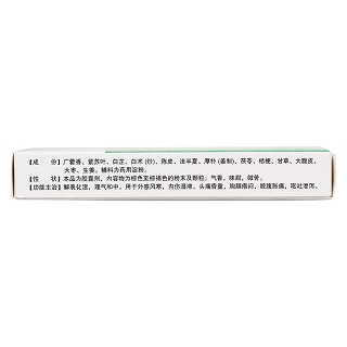 | 成分原料 | 苍术、陈皮、厚朴(姜制)、白芷、茯苓、大腹皮、生半夏、甘草浸膏、广藿香油、紫苏叶油、桔梗、生姜、大枣。辅料为淀粉。 |