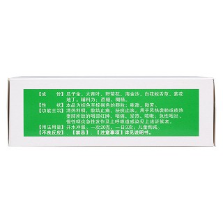 | 适用症状 | 清热利咽,散结止痛,祛痰止咳。用于风热袭肺或痰热壅肺所致的咽部红肿、咽痛、发热、咳嗽;急性咽炎、慢性咽炎急性发作及上呼吸道感染见上述证候者。 |