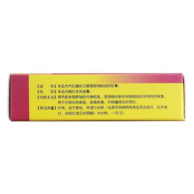 【功能主治】:调节肌体局部组织代谢机能,促进病灶肤色和细胞组织及特性的恢复。竹红菌素软膏用于外阴白色病变,疤痕疙瘩,外阴瘙痒及外阴炎。