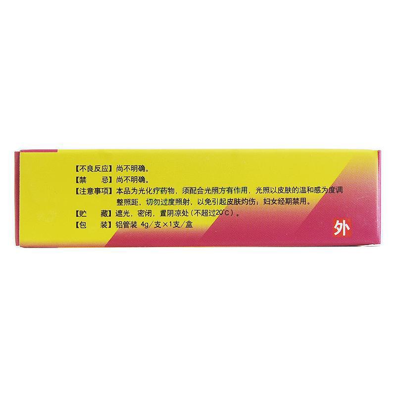 【注意事项】本品为光化疗药物,须配合光照方有作用,光照以皮肤的温和感为度调整照距,切勿过度照射,以免引起皮肤灼伤;妇女经期禁用。